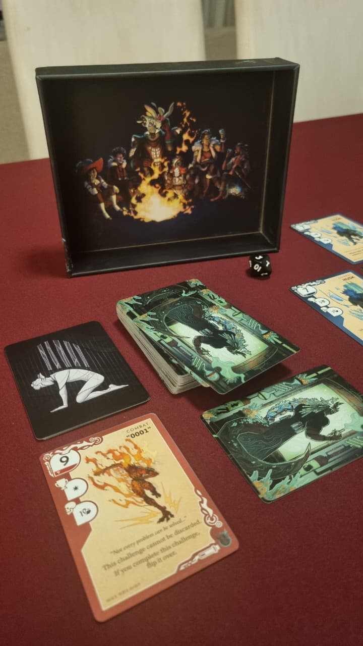 Num geral, achamos um jogo ok na primeira partida. Basicamente você escolhe as cartas com os icones e rola uns dados pra ter mais icones com o objetivo de derrotar o desafio à mostra.