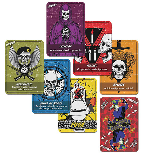 Quanto à arte, as cartas são muito, muito, muito bem desenhadas! Mesmo nas cartas mais simples (as de porrada), capricharam MUITO no traço! Além disso, Porradaria trabalha com uma paleta de cores tritone super interessante: