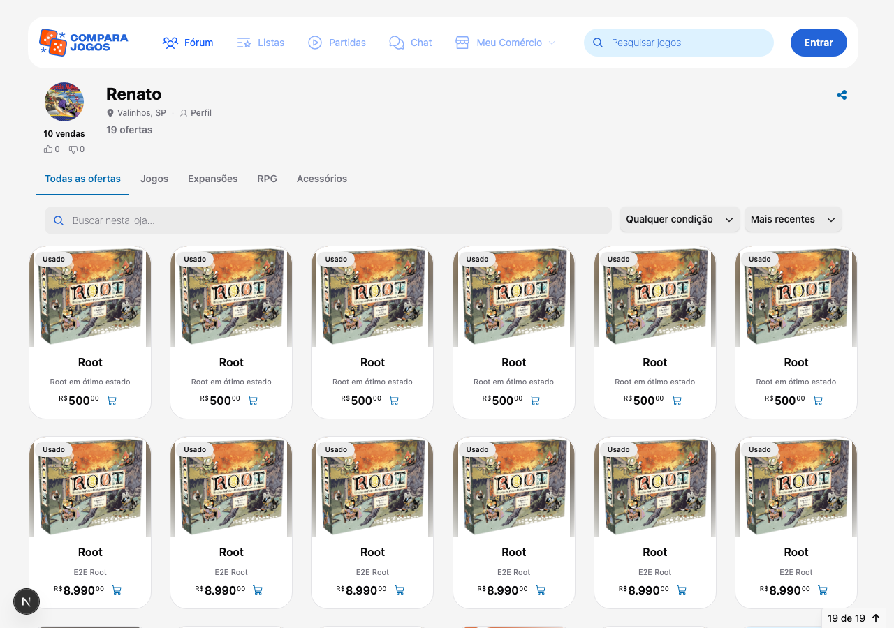 O Compara Jogos tem um marketplace integrado onde membros da comunidade podem comprar e vender jogos de tabuleiro, expansões, RPGs e acessórios entre si.