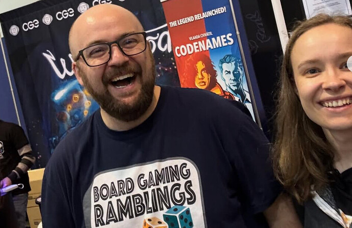 Encontramos e tietamos o casal do Board Game Rambling. Ele é gigante e ela, minúscula. Simpatia e malas cheias de jogos ganhos das editoras.