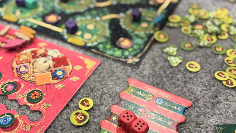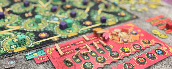 Para desespero da nossa lombar, abrimos, aprendemos e jogamos no chão do AirBnB do Bob. Druids of Edora (1x, Novidade) é bem produzido se comparado com tudo que já vimos da Alexa/Ravensburg. Papel e papelão mais mais robustos, arte muito bem trabalhada e madeirinhas que parecem miniatura. O jogo é um Feld como todo Feld, encare isso como quiser.