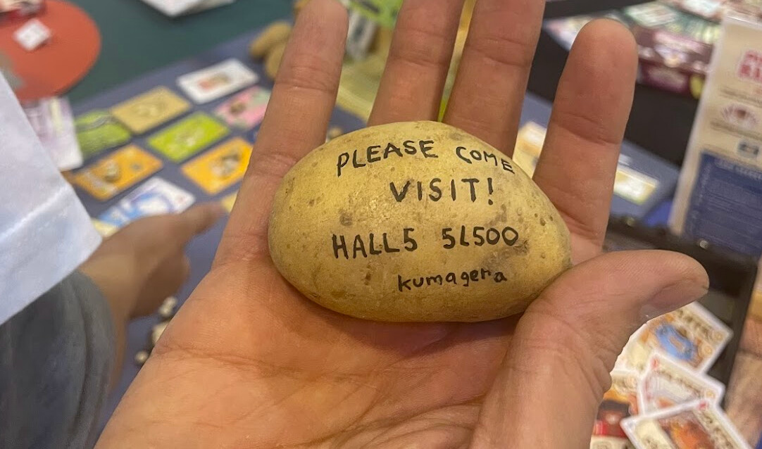 Conversamos por muito tempo sobre “o jogo das batatas”, que depois nos foi propriamente apresentado como Yotei. O estante estava cheio, então o Israel recebeu a explicação de uns 2 metros de distância do jogo kkkk