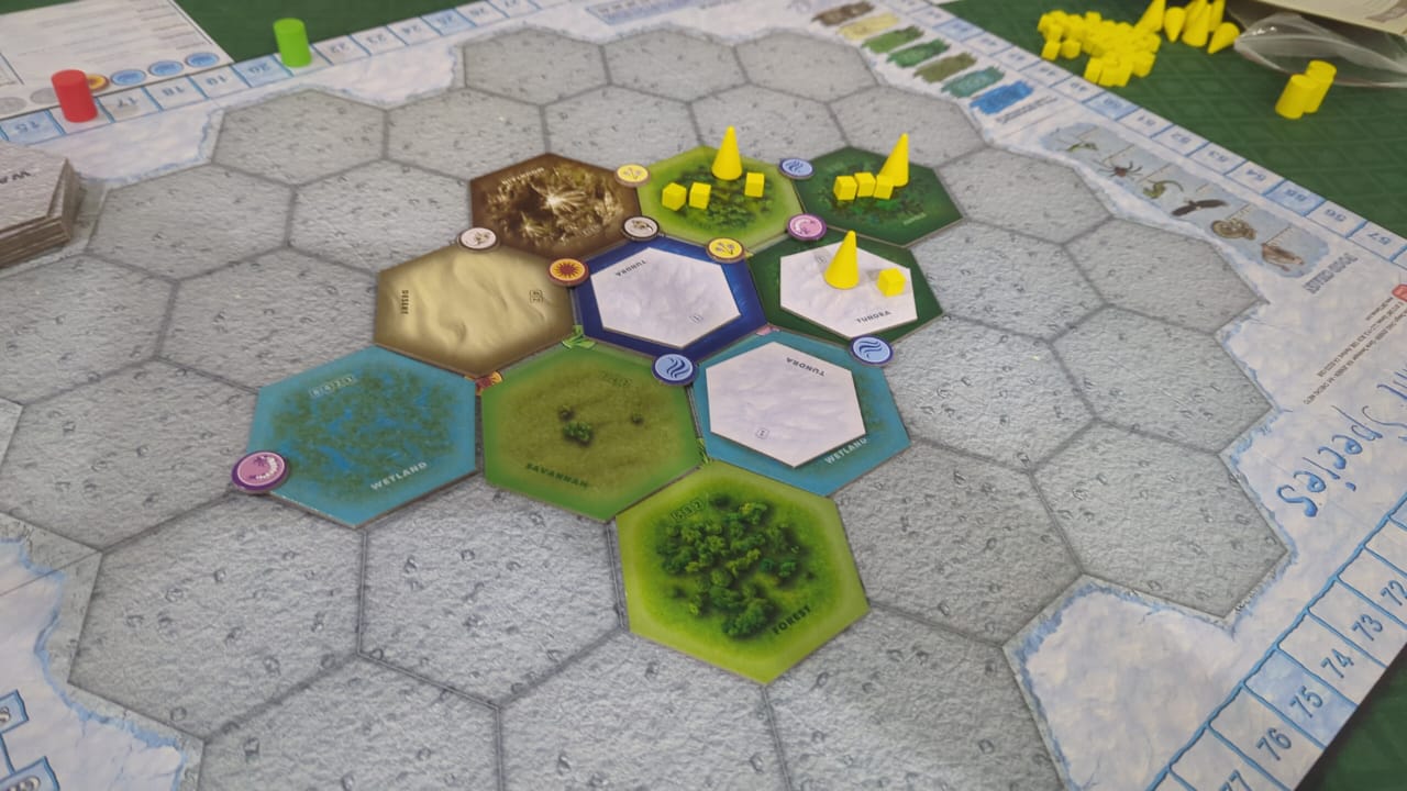 - 2 jogadores → Cada jogar precisa jogar com 3 especies, o que fica muito, mas muito pesado. Ainda mais que o seu placar final e o menor deles (Vai La Knizia). De verdade eu prefiro o Marines nesse count.