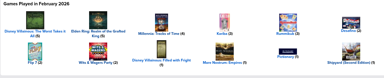 O Villainous foi por conta da minha filha mais nova, que se apaixonou pelo jogo. Ai, já viu, né. Outra coisa interessante foi jogar a campanha do Elden Ring e uma sequência enorme jogando o Millenia, que é um civ (tema colado com cuspe), que tem um esquema de trilha parecido com o Tapestry, mas menos overhead.