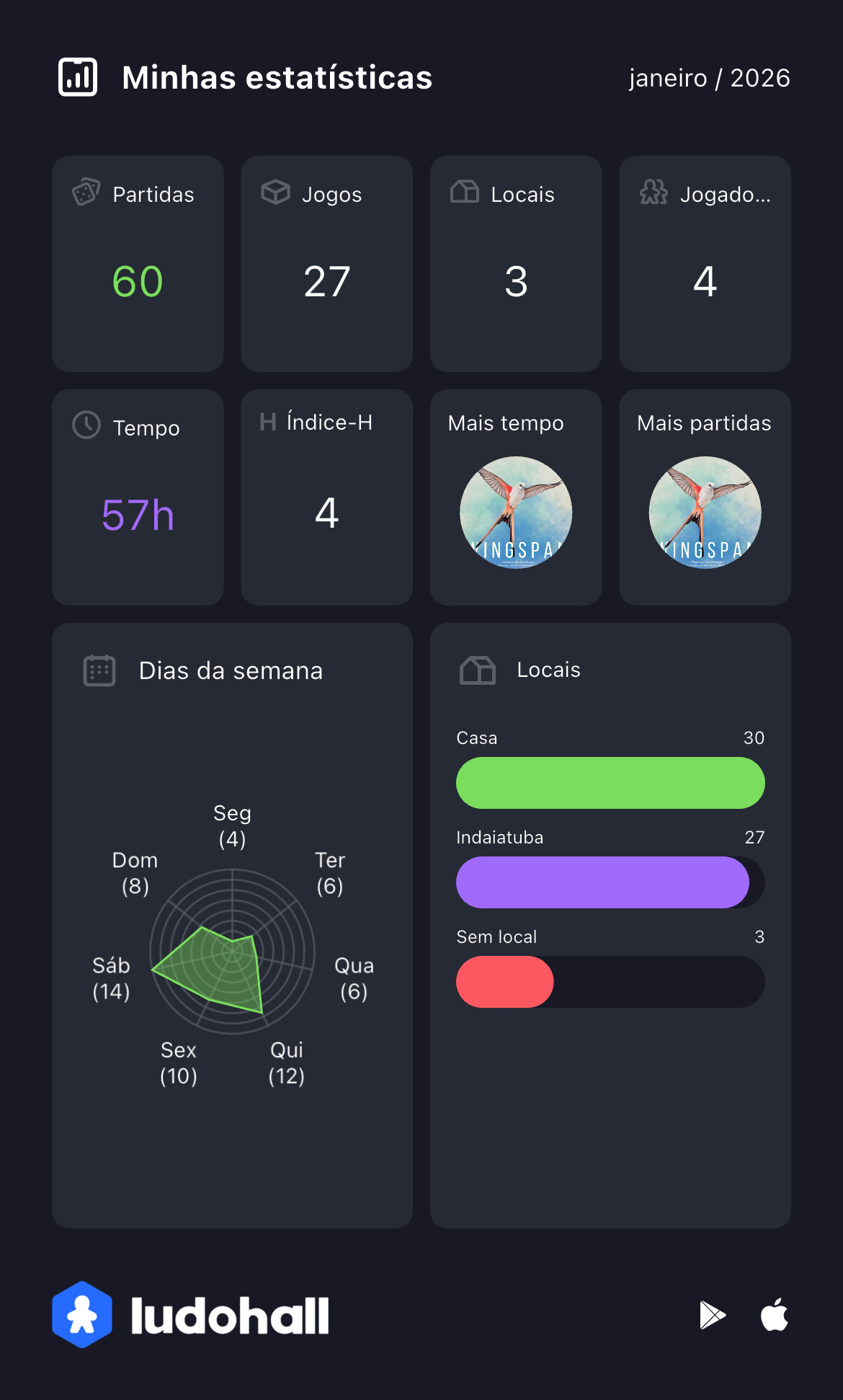 Comecei o ano bem! Acho que nunca antes tinha jogado tantas partidas num único mês. Sei que foi efeito do meu recesso, mais férias escolares da minha filha, tudo confabulou para ter um m6es produdivo. Infelizmente, tenho total consciência de que talvez isso nunca irá se repetir!
