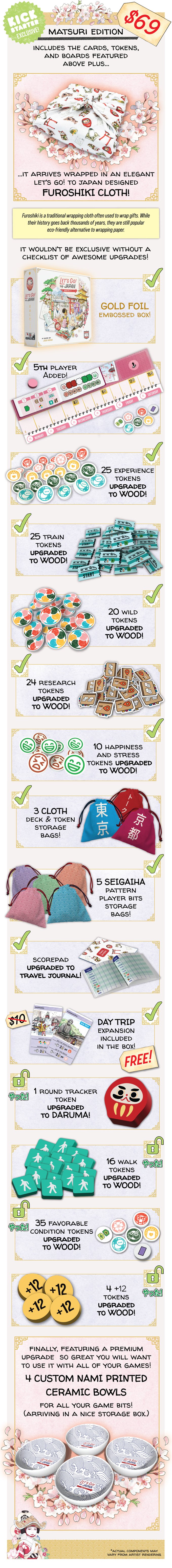 O jogo é incrivelmente visual, com cartas detalhadas e uma arte que evoca a paisagem japonesa. Cada destino e atividade são ilustrados com muita atenção ao detalhe, transportando os jogadores para o país. Destaque para a versão de luxo, com componentes de madeiras e acessórios temáticos.