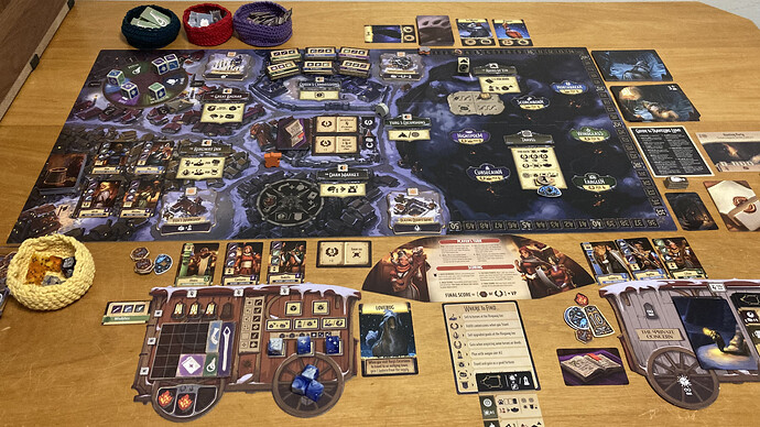 Merchants of the Dark Road é um jogo de complexidade média. Neste momento caindo no 3.3 de 5 no bgg, mas jogando ele me pareceu um pouco abaixo disso (eu diria um 2.8). As regras são no geral simples, diretas e temáticas, e a estratégia fica realmente em otimizar os seus turnos. Existem muitas opções do que fazer, e pelo menos em 1 ou 2 jogadores você não vai ter um turno inútil por mau planejamento ou porque outro jogador pegou algo do tabuleiro que você queria. Não é um jogo apertado, mas fica claro que quem espremer o máximo de eficiência em seus 13 turnos será o vencedor.