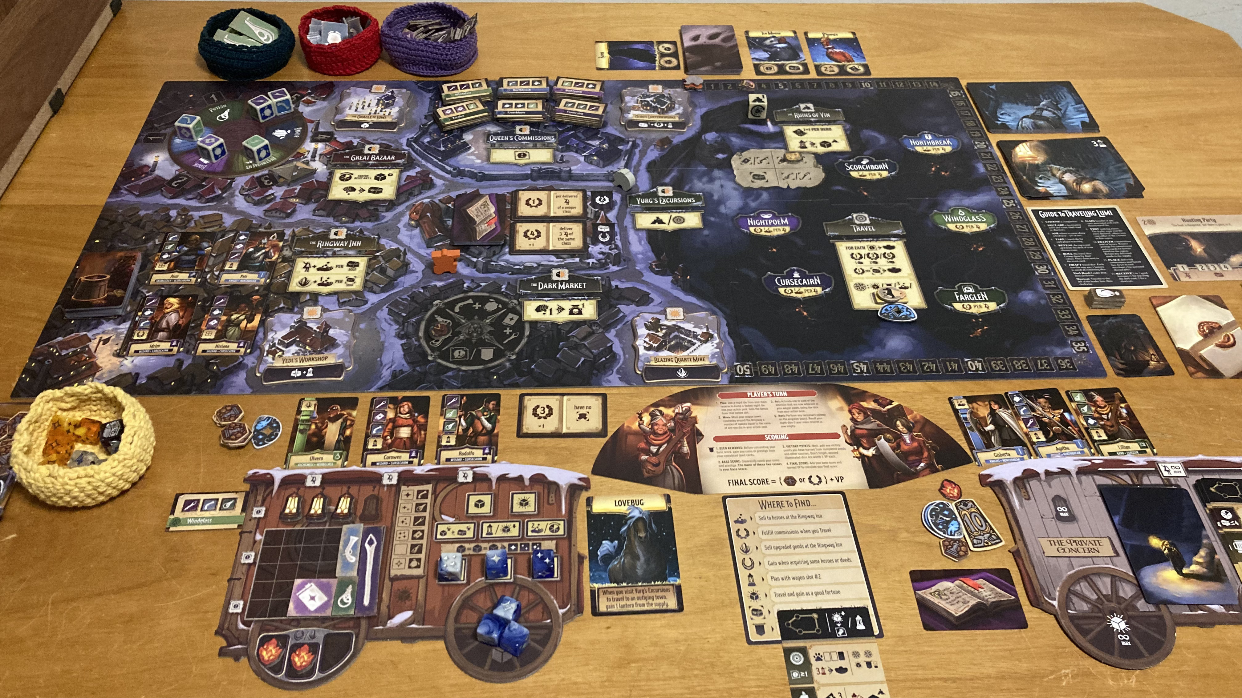 Outros componentes importantes são as cartas de deeds (condições de pontuação no final de jogo), dados iluminados (permitem uma ação extra e acessar um dos mercados), o tabuleiro de carroça de cada jogador (quadriculado, onde você posiciona os itens no estilo tetris - que remete ao gerenciamento de inventário de videogames antigos).