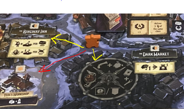 Em cada turno, você irá selecionar um dado para usar - ele irá determinar um bônus (como ganhar 2 moedas, ou fabricar um item) e o valor do seu movimento, em um rondel de cinco espaços, em que cada um fica no meio de duas possíveis ações que você poderá fazer.