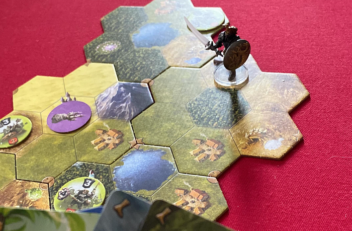 Mage Knight (1x): mais um tutorial (mi descurpi!), dessa vez com as peças de campo aleatórias ao menos. Já senti a variabilidade enorme só com essa mudança. Já de cara, em vez dos tradicionais Orcs jaguara, veio uma torre de mago. Entrei nela e fui açoitado por um mago de fogo brabo. Sai com o entre as patas e aprendi que quando se é derrotado nessas invasões, você volta de onde partiu (é expulso do local mesmo!). Fiz menos pontos, indicativo que o jogo pode ter bastante variação de acordo com o que sai no início do mapa e as decisões (ruins) que tomamos.