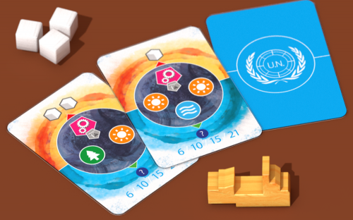 Agora chegamos à temática do jogo. Dentre uma série de “metas de desenvolvimento sustentável” propostas pela ONU e adotadas pelos países, uma delas é a da Convenção de Paris em 2015: evitar que a temperatura média no mundo suba mais do que 2ºC até 2040 (com uma segunda meta de 1,5ºC se possível). Os dois maiores motivos para o aumento da temperatura global são, primeiro, o uso de combustíveis fósseis (tanto por automóveis quando pela indústria) e, segundo, o desmatamento. Ou seja, os dois principais motivos estão diretamente ligados à presença do CO2 na atmosfera. A queima dos combustíveis o libera na atmosfera, e o desmatamento diminui a sua absorção pelas plantas de volta à terra de onde o carbono veio inicialmente. O jogo se fundamenta em instalar usinas de energia alternativa e reflorestamento nos seis continentes, de forma que eles não precisem continuar aumentando a emissão de CO2 para atender a demanda energética crescente causada pelo crescimento econômico e industrial. Cada jogador representa uma empresa que prestará serviços aos governos das nações para auxiliar no cumprimento das metas. Um propósito nobre, uma união das capacidades econômicas, administrativas e científicas. Assim o mundo vai pra frente!