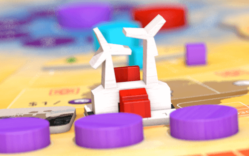 O jogo pode ser jogado de forma solo, cooperativo e competitivo – achei isso muito legal, pois os jogos cooperativos são os meus favoritos. Ele é dividido em quatro décadas, de 2010 a 2040. Nelas, cada jogador tem um número limitado de ações principais, que envolvem 1) projeto de usinas verdes, 2) construção de infraestrutura de distribuição da energia a ser produzida e 3) construção da usina. A fase de proposta atrai recursos do governo e mobiliza a comunidade científica. A fase de infraestrutura mobiliza a administração dos países para pagar o feitio da rede, e também dá know-how e acesso ao financiamento governamental para as empresas. Na fase de construção das usinas, a empresa tem que mostrar o seu trabalho e colocar a usina para funcionar. São 5 tipos de usinas: eólica, solar, hidrelétrica, reciclagem e reflorestamento, cada uma com suas peculiaridades in-game.