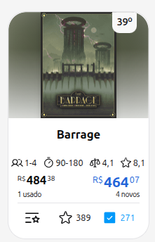 3: Extras - Um jogo usado bem conservado com sleeves, e insert é mais caro que um novo o Barrage por exemplo, um insert da Bucaneiros custa somente do Barrage já custa mais de R$100,00 o jogo usado pode ter isso e muito mais (no caso não estou falando da situação em especifico, mas só exemplificando)