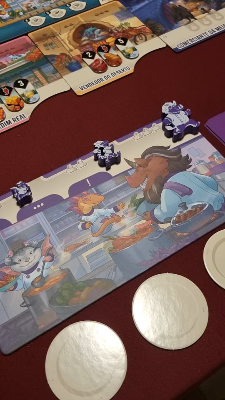 A nossa primeira partida não foi muito fluída, muita coisa pra ir ajustando durante a rodada, então por aqui como normalmente só eu leio as regras de inicio, era muita coisinha pequena pra fazer manutenção (repõe ingredientes, vira carta, volta meeples, muda prioridades, carta de sous-chef) e acabou dando uma canseira em alguns momentos.