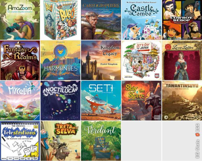 - verdant é um pouco de trapaça, joguei solo no BGA, mas tenho o físico (que gostei bastante de jogar em 2) para testar na mesa em breve. Mas gostei e fica na coleção.