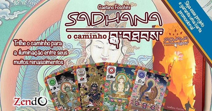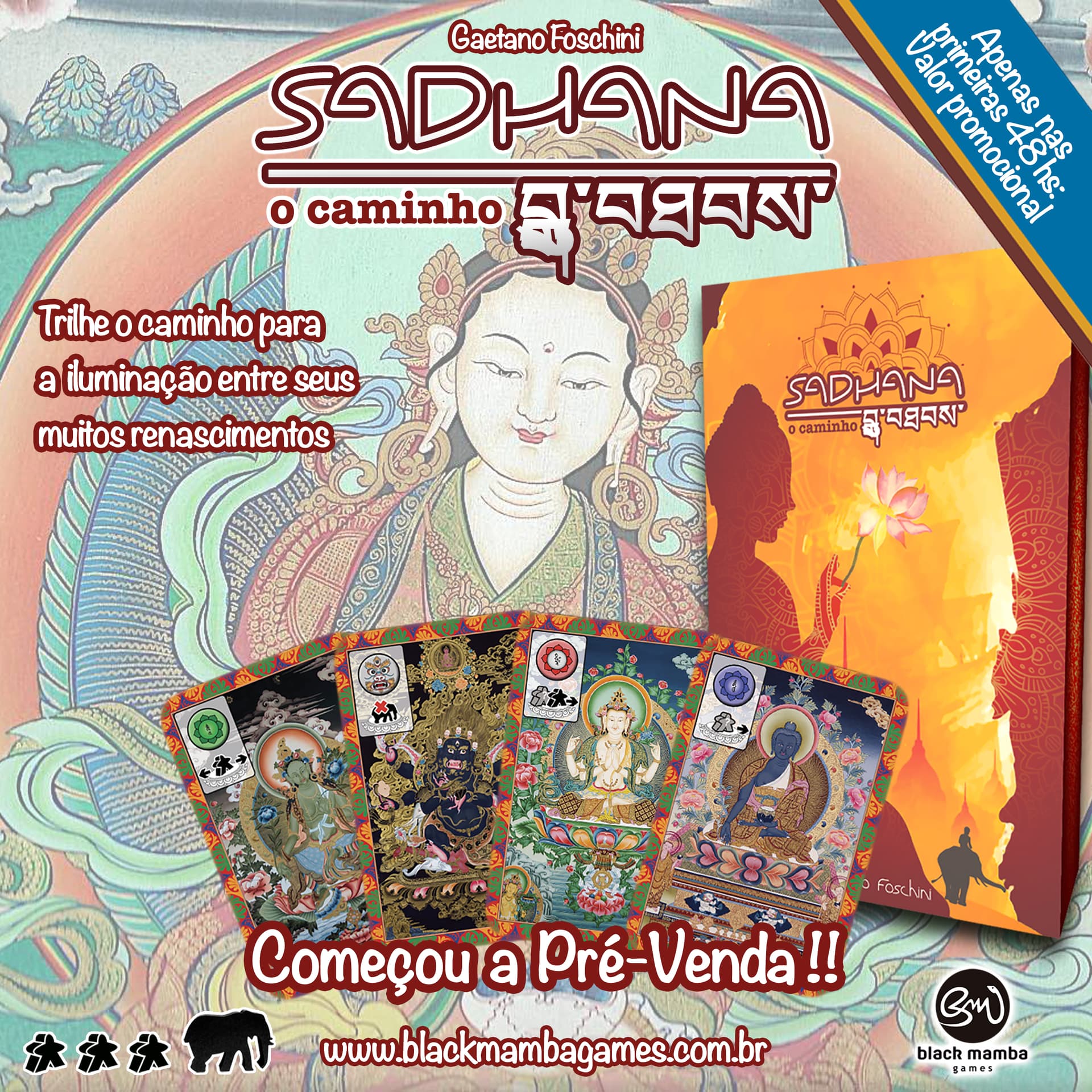 Sadhana: O Caminho é mais um jogo do autor Gaetano Foschini (La Muse, Muamba, Noh, ElvenTrolls) trazendo agora uma implementação um tanto diferente neste carteado com mecânica de escalada sem valores numéricos, onde as cartas poderão ter valores variados conforme o posicionamento dos jogadores na trilha espiritual, e a cada renascimento eles poderão executar os efeitos de suas cartas das quais possuam a dominância na mesa, movimentando-se assim com seus marcadores de Lama pela trilha espiritual.